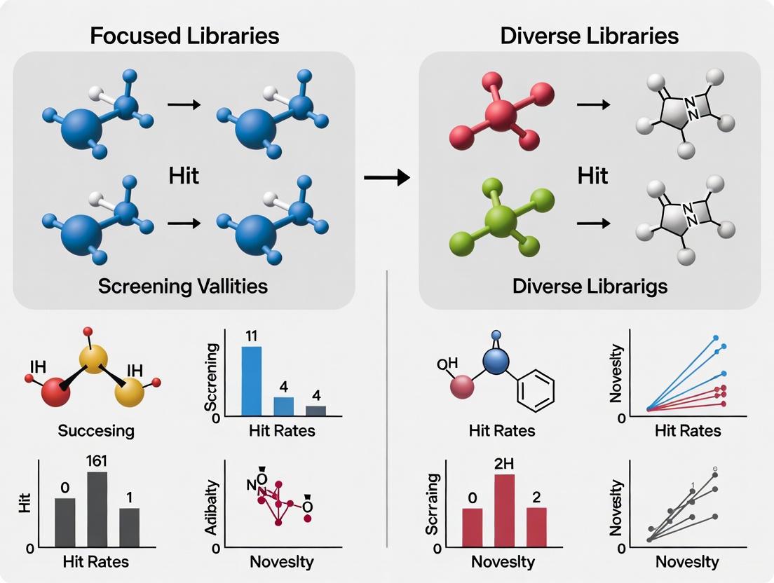Hit identification is a critical, foundational stage in drug discovery, and the choice of screening library profoundly impacts the campaign's success. This article provides a comprehensive comparison of focused and diverse chemical libraries, examining their underlying principles, strategic applications, and comparative efficacy. Drawing on current methodologies—including DNA-encoded libraries (DELs), High-Throughput Screening (HTS), and target-focused design—we explore how to select and optimize the right library type for specific target classes and project goals. We also address common challenges like false positives and chemical space limitations, offering troubleshooting and optimization strategies. Finally, we synthesize key performance metrics and discuss how emerging technologies like machine learning are shaping the future of hit discovery, providing actionable insights for researchers and drug development professionals to enhance efficiency and success rates.