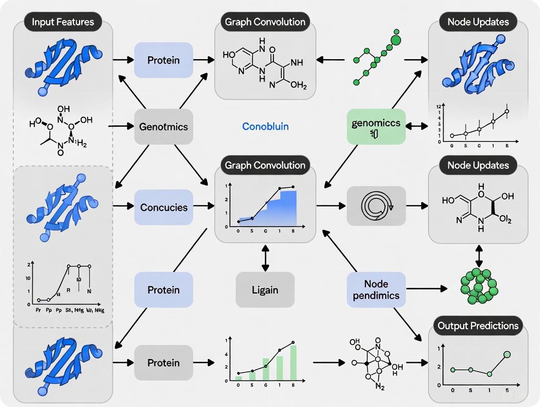 The MPNN framework provides a generalized and flexible abstraction for GNNs, unifying many specific architectures [10]. It formalizes the operation of a GNN into two phases: a message-passing phase and a readout phase. During the message-passing phase, each node receives "messages" from its neighboring nodes over several time steps, progressively refining its own representation. The readout phase then aggregates all node representations into a graph-level embedding for downstream tasks like binding affinity prediction [10]. The Proximity Graph Network (PGN) is a prime example of an MPNN application for protein-ligand complexes. PGN constructs a unified graph containing both ligand atoms and proximal protein atoms, connecting them with "proximity edges" that allow information to flow between the two molecules during learning [10]. This explicit modeling of the intermolecular interface is a key reason for its strong performance in affinity prediction tasks.